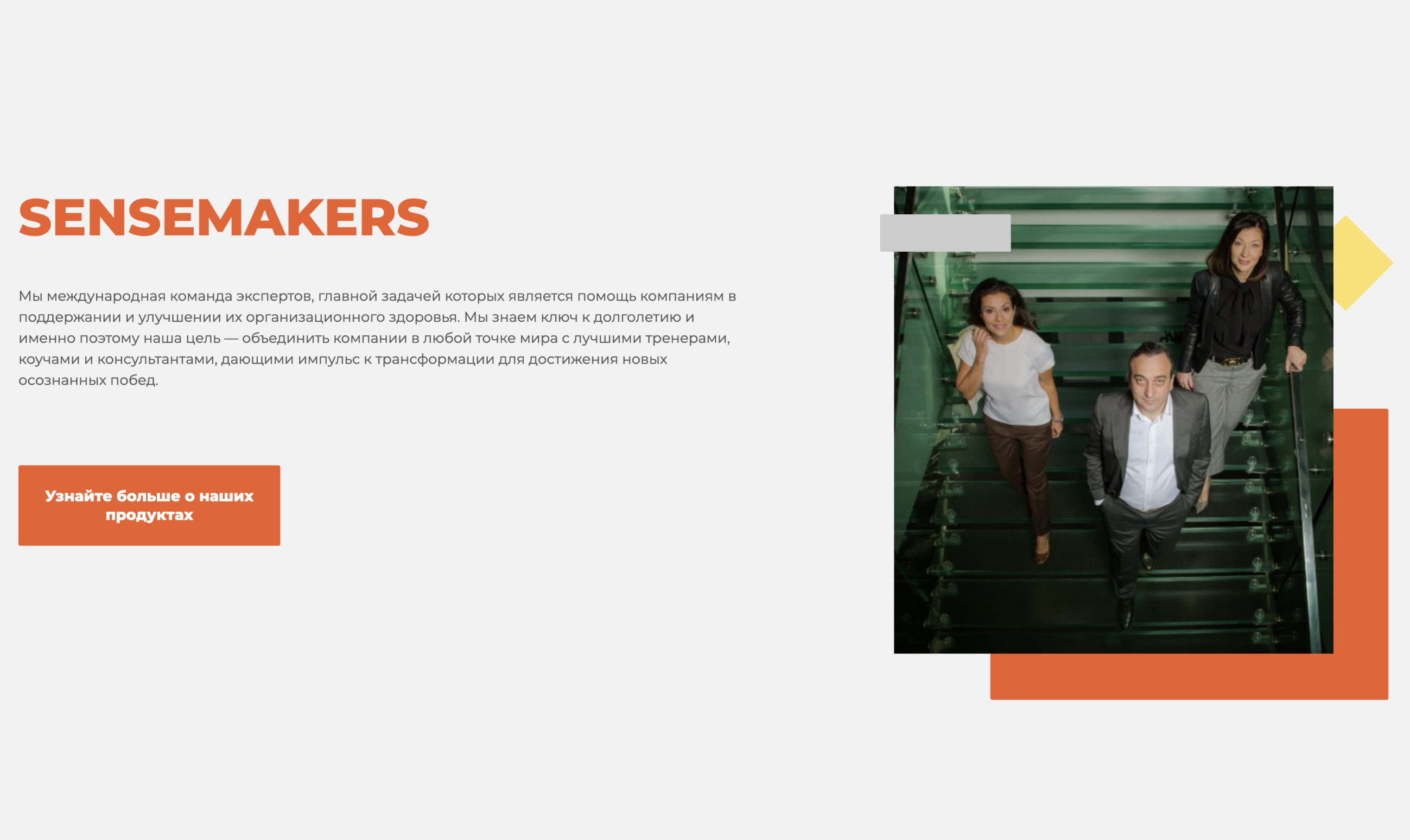 Sensemakers — это международная команда экспертов, главной задачей которой является помощь компаниям в поддержании и улучшении их организационного здоровья. Sensemakers знают ключ к долголетию и именно поэтому их цель — объединить компании в любой точке мира с лучшими тренерами, коучами и консультантами, которые дают импульс к трансформации для достижения новых осознанных побед.