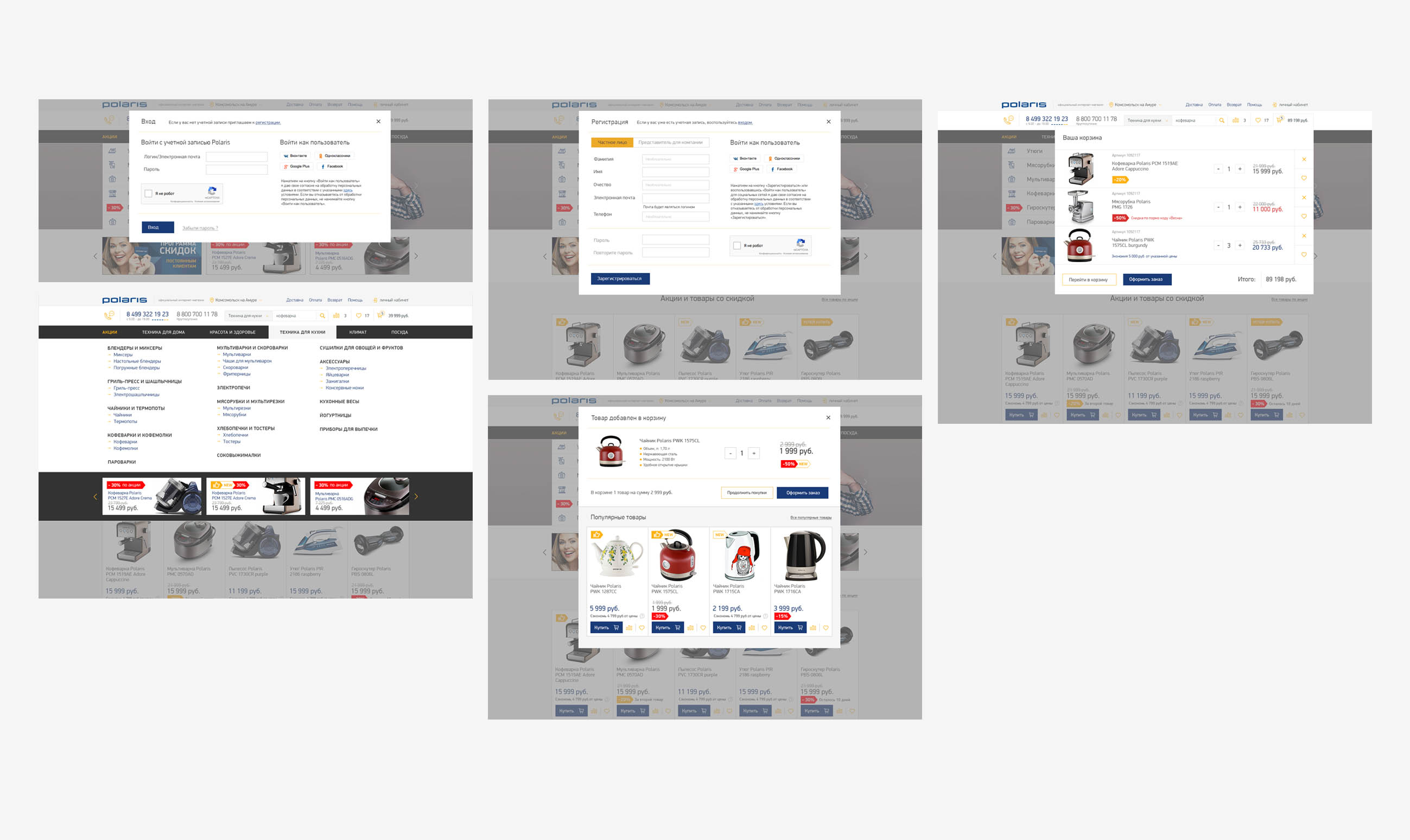 В дизайне Интернет-магазина мы использовали стилистику, разработанную для корпоративного сайта Polaris. Интерфейс магазина стал еще более минималистичным для того, чтобы сфокусировать пользователя на продукции бренда и ее продающих свойствах (УТП).