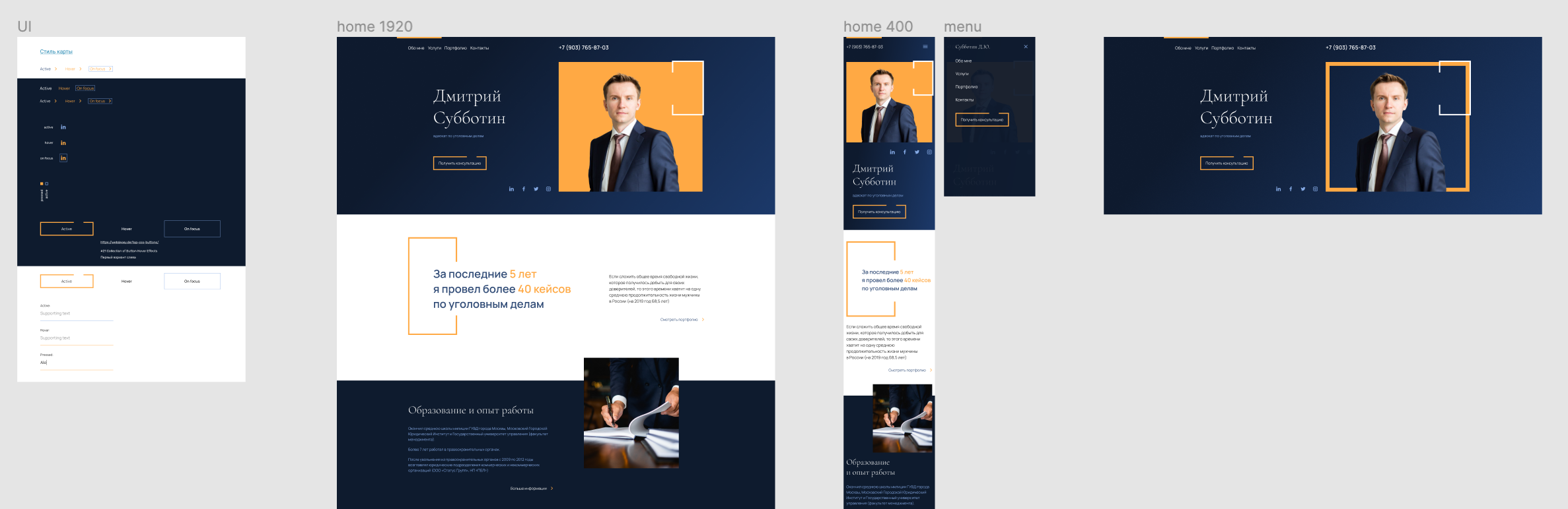 Для второй версии сайта мы полностью переработали дизайн. Визуальная подача стала еще более статусной, лаконичной и минималистичной. Также на сайт были добавлены кейсы, сведения об участии в публичных процессах и информация о повышении квалификации.